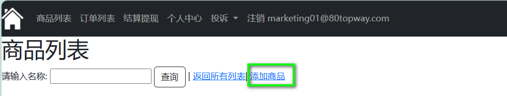 1.在商品列表页面点击"添加商品"按钮, 跳转创建商品页面。