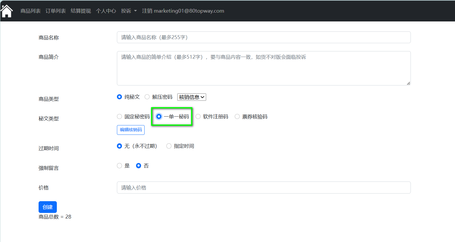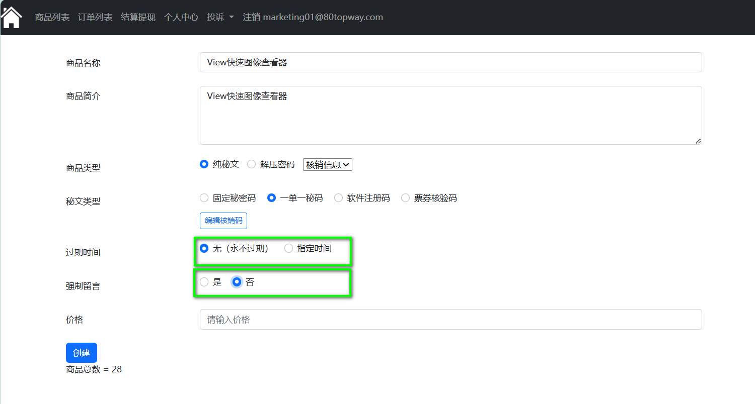 5.指定过期时间以及是否需要留言,填写商品价格,当商品已过期终端用户将无法购买此商品,发码用户选择需要强制留言,此时终端用户必须填写留言才可以购买商品,商品内容填写完成,点击“创建”按钮。