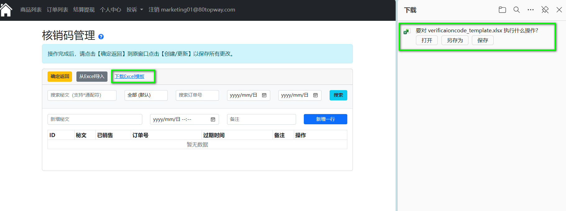 2.点击“编辑核销码”按钮,跳转到核销码管理页面,下载 EXCEL 模版。