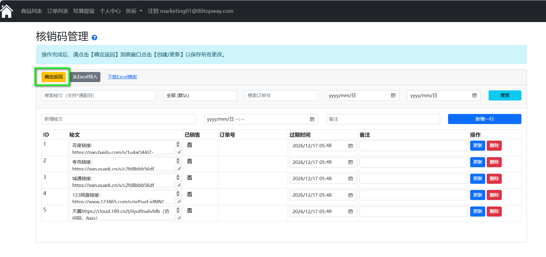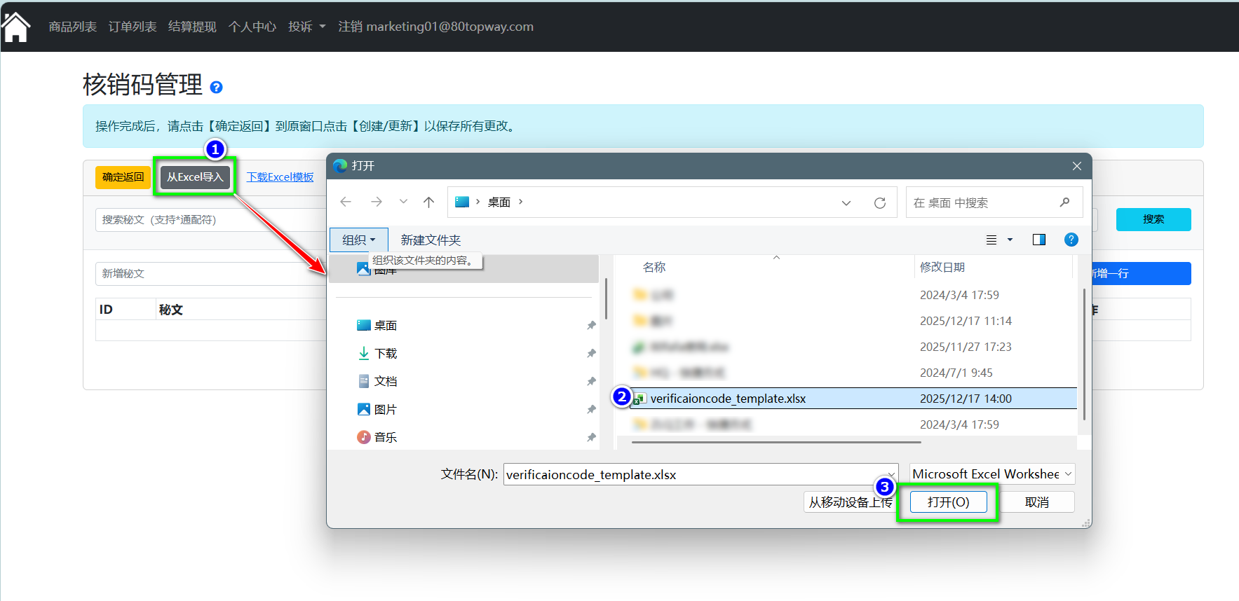 4.已填写完核销码表格,在核销码管理页面点击“从 Excel 导入”按钮,选中需导入的文件并点击“打开”按钮,这样就把核销码内容导入到此页面,点击“确定返回”按钮回到创建商品页面。