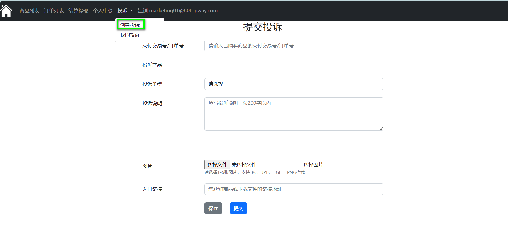 1. 注册登录帮您发发官网,在菜单栏中点击投诉--创建投诉,可在创建投诉填写相应内容、投诉说明、证明图片等信息。填写完成后点击保存提交。