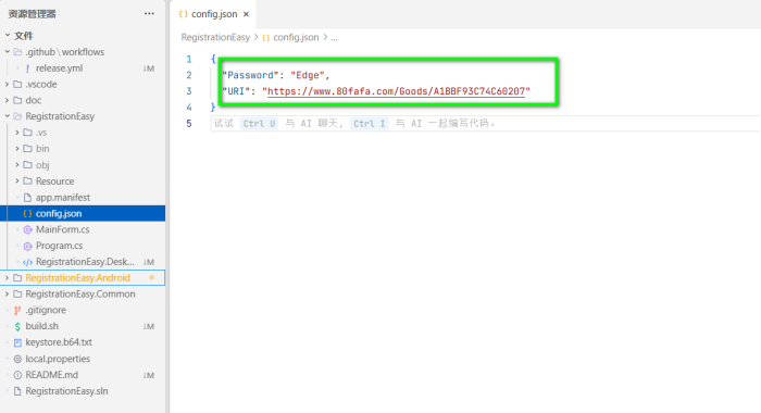 在示例程序中 Config.json 文件以明文方式填写了商品加密密钥(Password)和商品购买链接(URI),这仅为示例。出于安全考虑,建议将这两项敏感信息改为在编译时通过 DL(或预编译指令)等方式嵌入,避免在配置文件中明文存储。