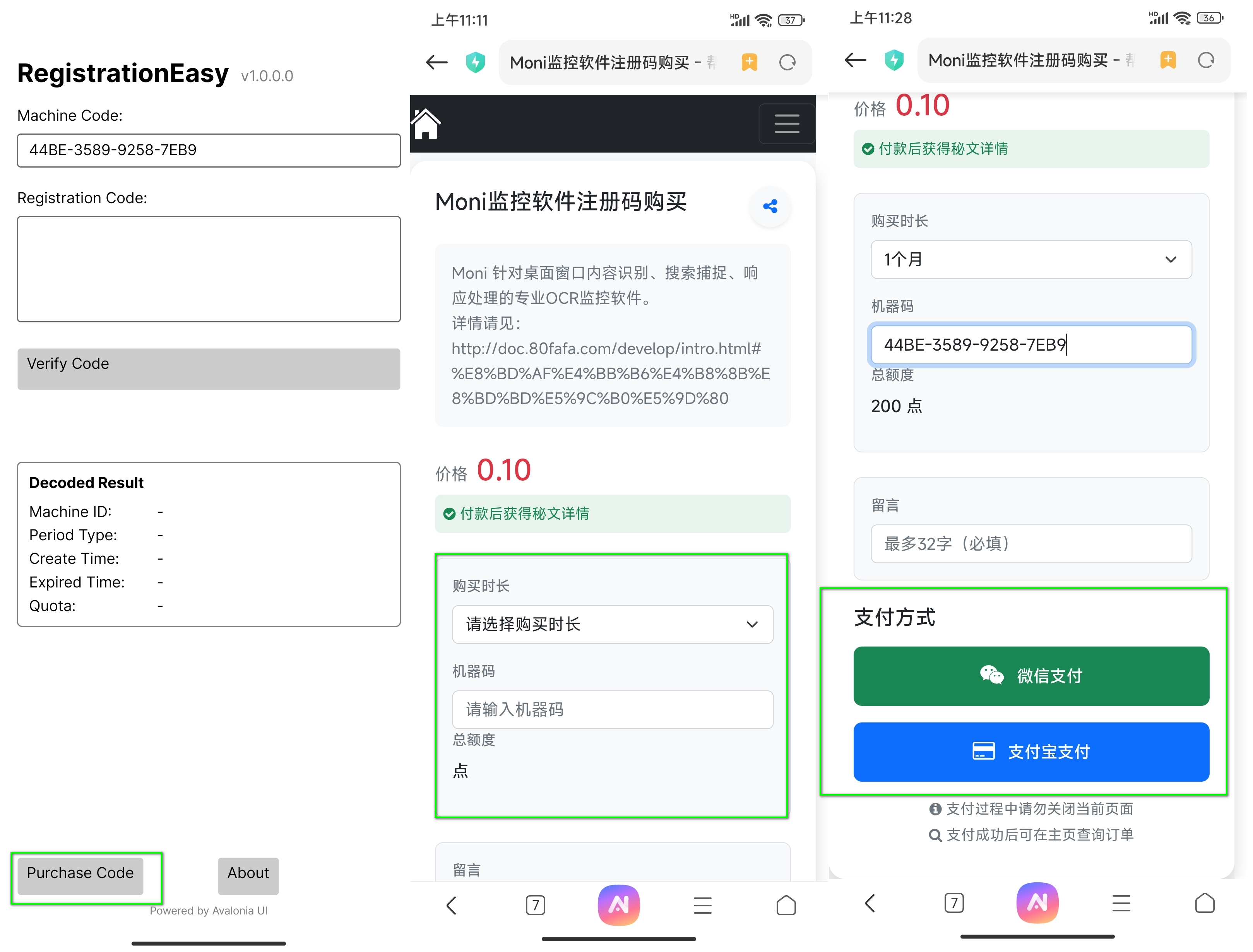 (3)在 RegistrationEasy 程序上复制 Machine Code,点击"Purchase Code"按钮跳转到购买页面,用户选择购买时长并将复制的 Machine Code 粘贴到机器码,然后进行付款以获得秘文,此秘文即为注册码。