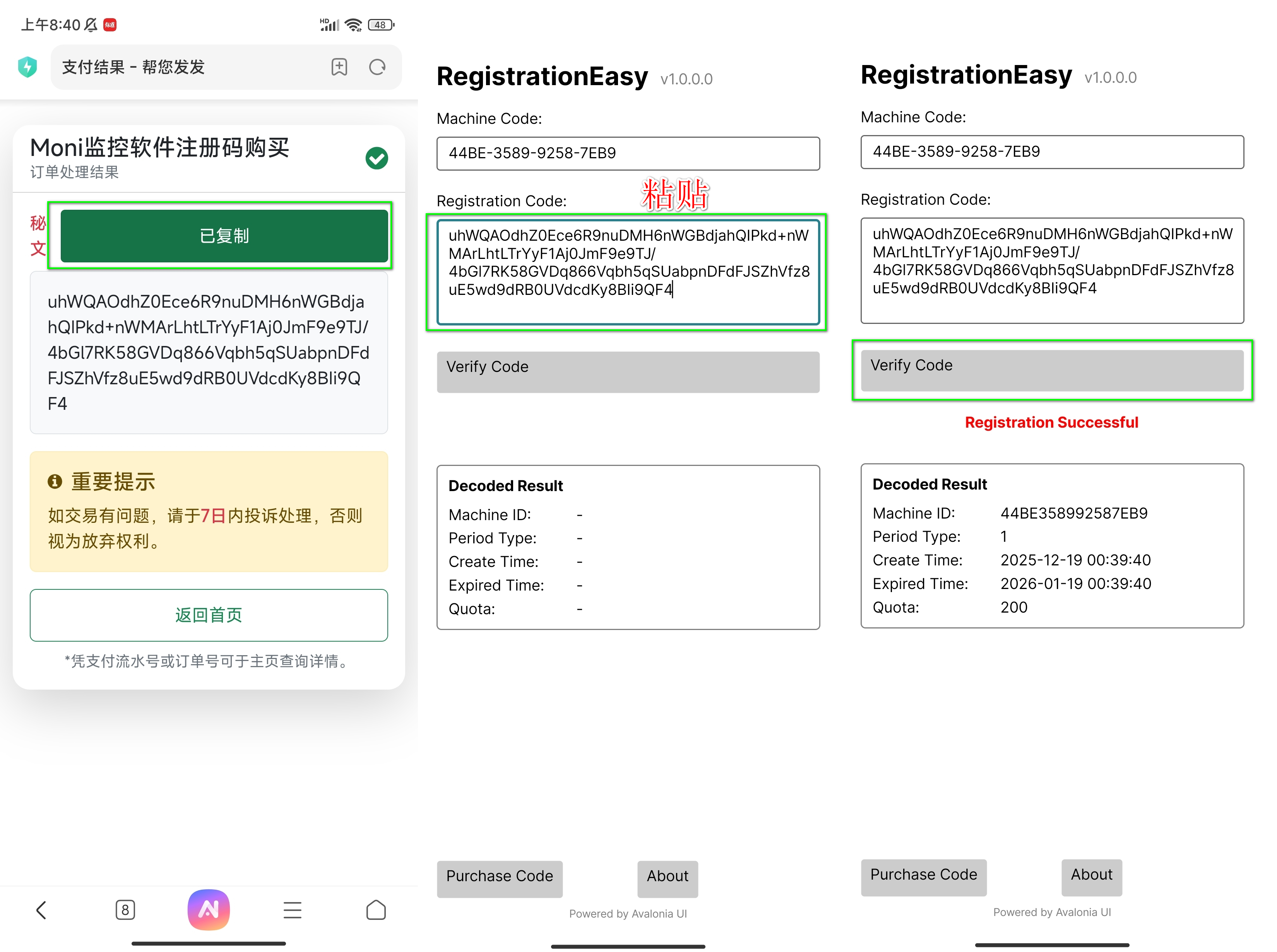 (4)在支付结果上复制注册码(秘文),粘贴在 RegistrationEasy 程序的 Registration Code 的输入框中,点击“Verify Code”进行注册码验证,验证成功会显示商品信息,包括机器码、创建时间、有效时长、过期时间和额度。