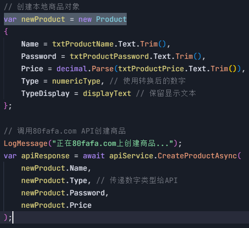 1. 程序把商品信息打包并发送到 https://80fafa.com/api/ProductApi/CreateProduct ,等待服务器回复。