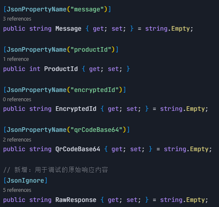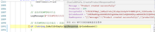 1. API响应代码:用于接收和解析创建商品接口的响应数据;从API响应中获取Base64格式的二维码。